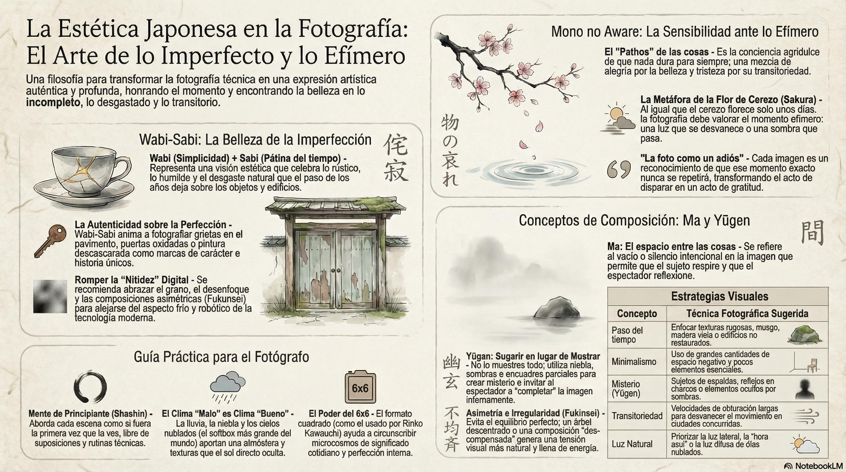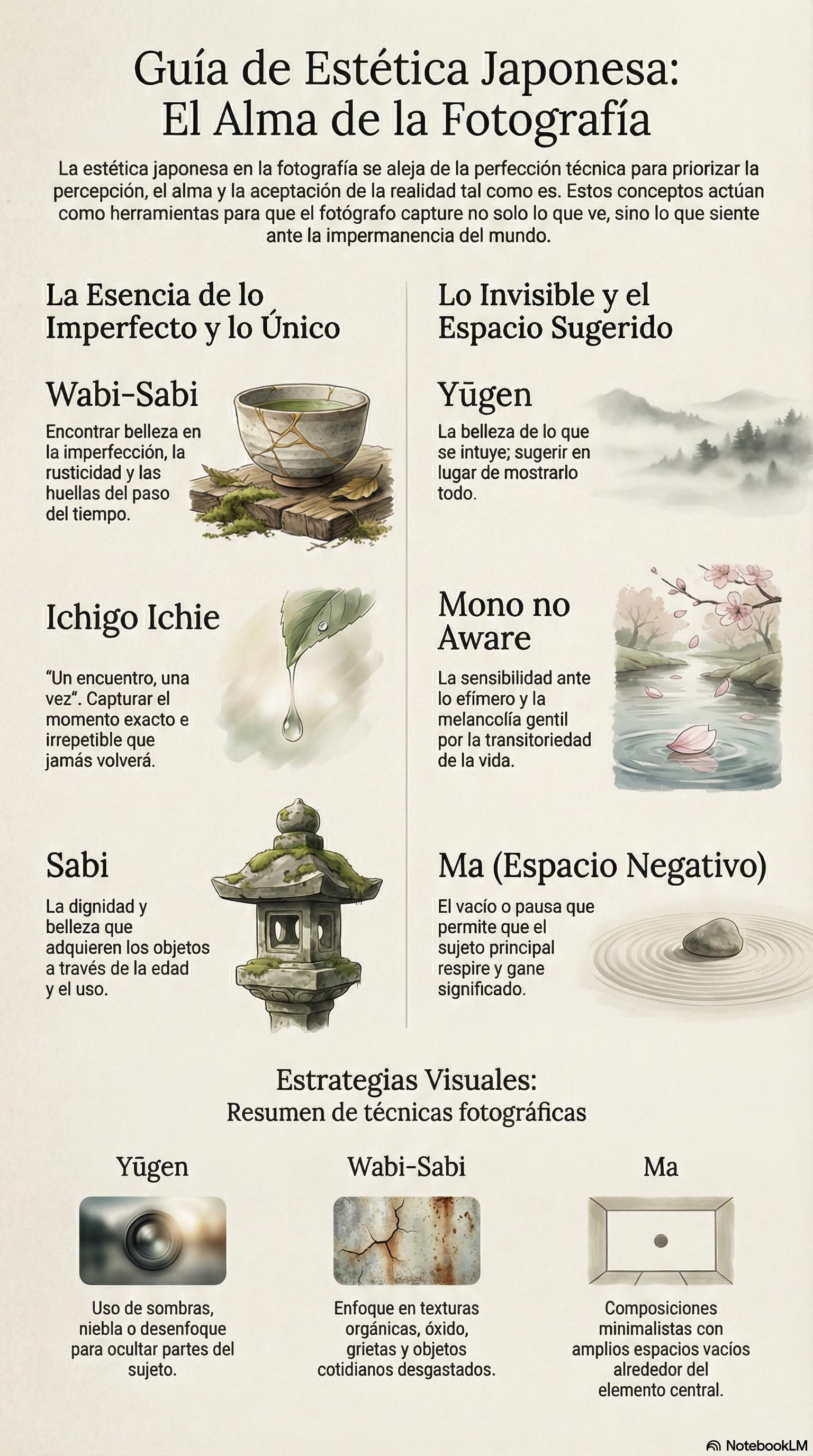 | Mono no aware | La emoción ante lo temporal y lo que un día dejará de estar | Lo banal cotidiano, hábitos, rincones, luces repetidas, objetos sin épica | Tristeza teatral, sentimentalismo decorativo, solo grandes momentos | “Todo se va. Fotografía eso.” |