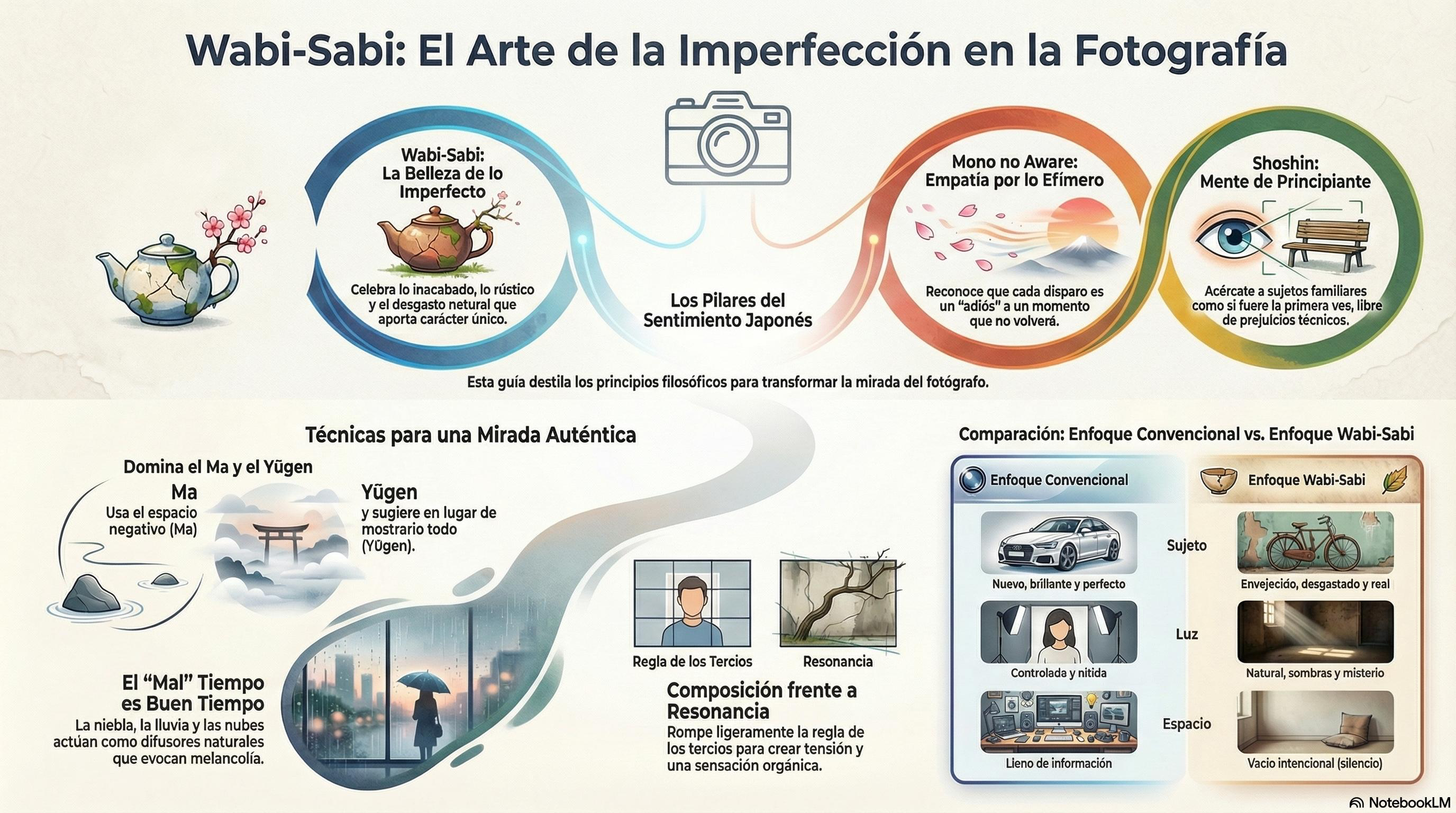 La austeridad no es la ausencia de algo, sino la presencia de lo esencial. Wabi aparece cuando una imagen deja de buscar impacto y empieza a aceptar que no hace falta “más” para tener verdad.